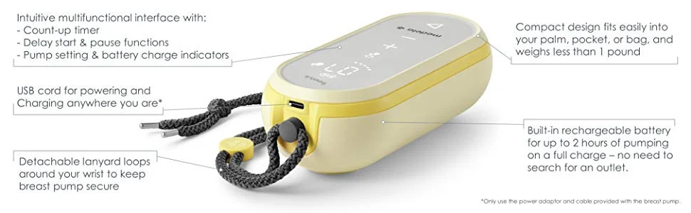 - Pin sạc được cài đặt vĩnh viễn có thể dễ dàng sạc lại qua USB khi không thể cắm trực tiếp vào. - Mỗi lần sạc có thể được sử dụng cho tối đa 8 lần hút di động. - Thời lượng pin 2 giờ giữa các lần sạc đầy (3-4 giờ) giúp bạn chủ động hơn khi ra ngoài. (Lưu ý: Chỉ sử dụng bộ chuyển đổi nguồn và cáp đi kèm với máy hút sữa để đảm bảo máy hoạt động tốt hơn).