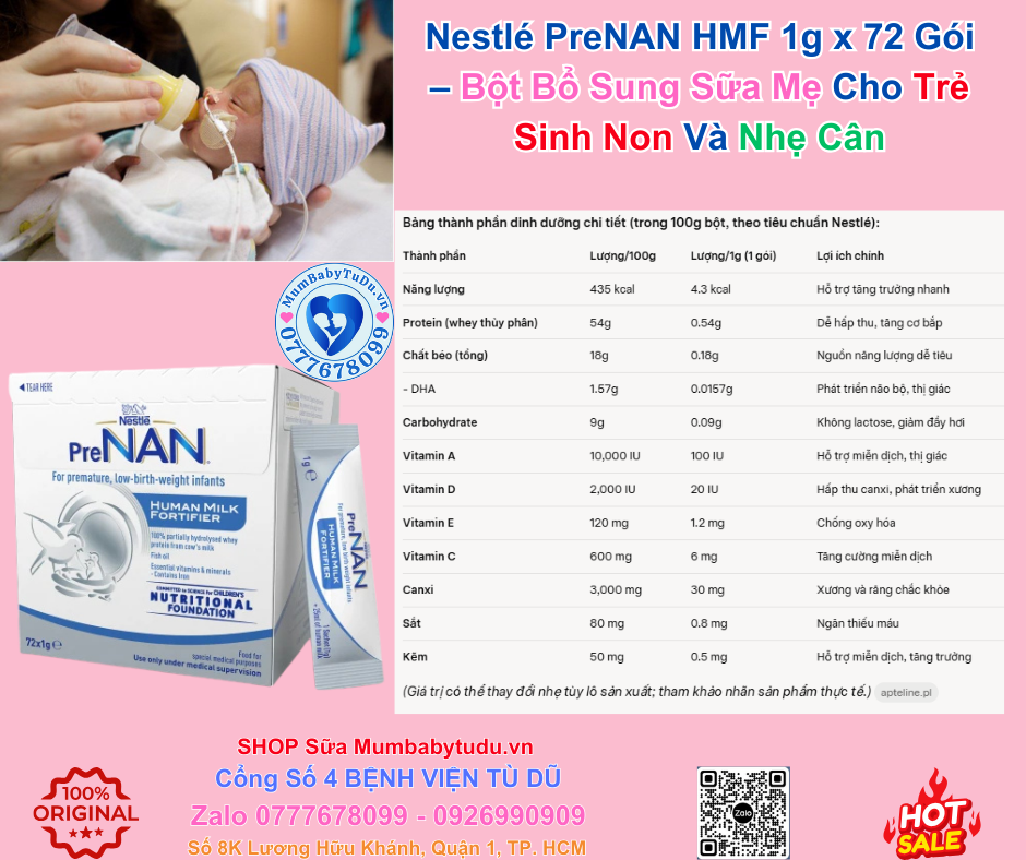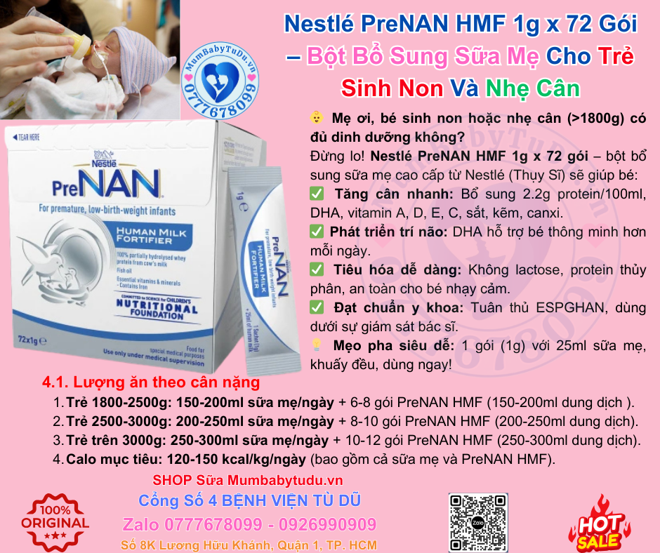 Nestlé PreNAN HMF 1g x 72 gói là giải pháp dinh dưỡng y học hàng đầu để bổ sung sữa mẹ cho trẻ sinh non, nhẹ cân, thiếu tháng hoặc rất nhẹ cân, giúp bé tăng cân nhanh, khỏe mạnh và phát triển vượt bậc. Với giá phải chăng năm 2025, thành phần an toàn và review tích cực từ hàng ngàn mẹ Việt Nam, đây là lựa chọn lý tưởng để mẹ chăm sóc bé yêu. Đừng chần chừ – liên hệ Mum Baby Từ Dũ ngay hôm nay để được tư vấn miễn phí, giao hàng nhanh và ưu đãi đặc biệt (giảm 10% cho đơn hàng đầu tiên)!