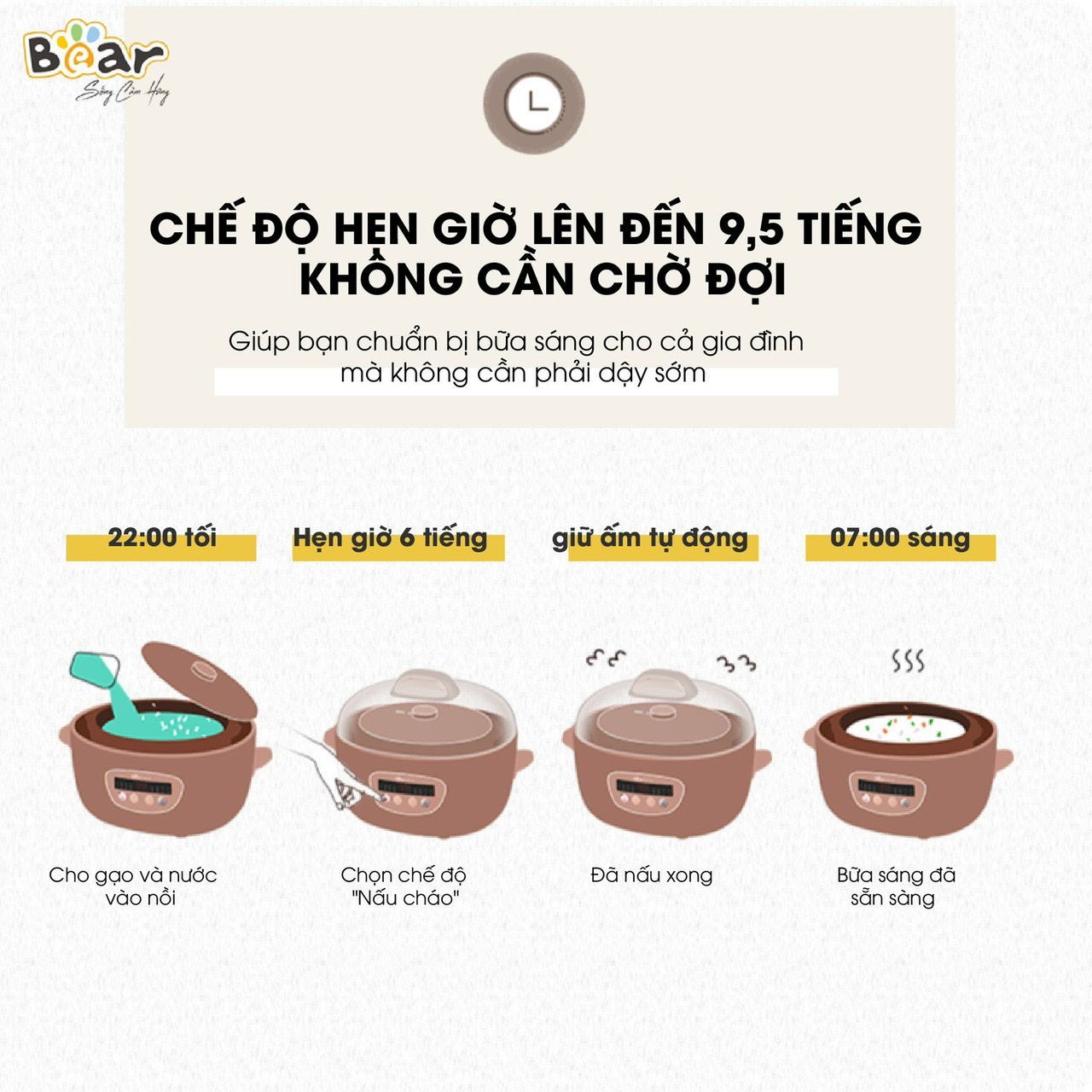 Ưu điểm nổi bật của nồi nấu chậm 2.5L Bear là tiết kiệm thời gian nấu. Ngoài ra, nồi còn có chức năng hẹn giờ trước khi nấu lên tới 9.5 tiếng rất tiện lợi. Bạn sẽ không cần lo lắng về việc dậy sớm chuẩn bị đồ ăn mang tới cơ quan, vất vả chuẩn bị bữa cơm cho gia đình hay bị muộn bữa ăn dặm cho bé.