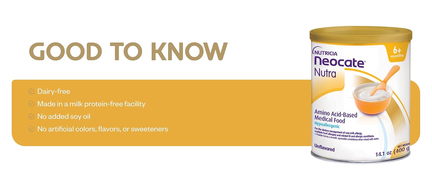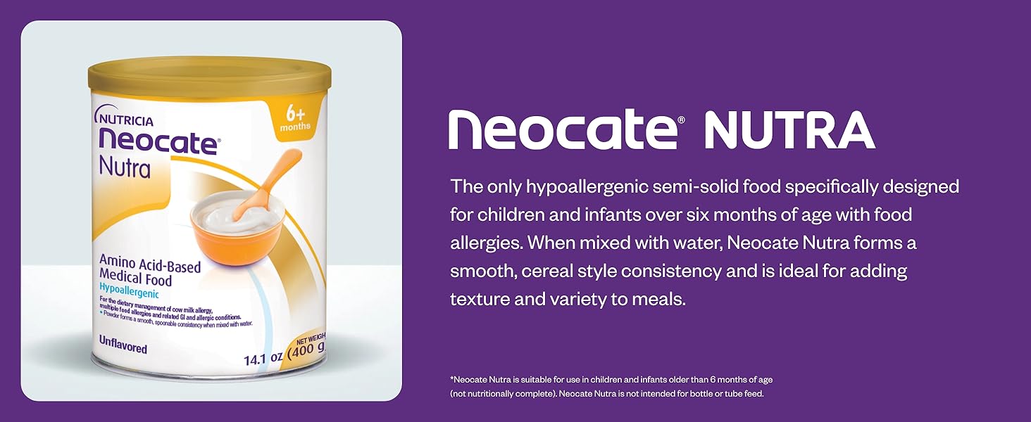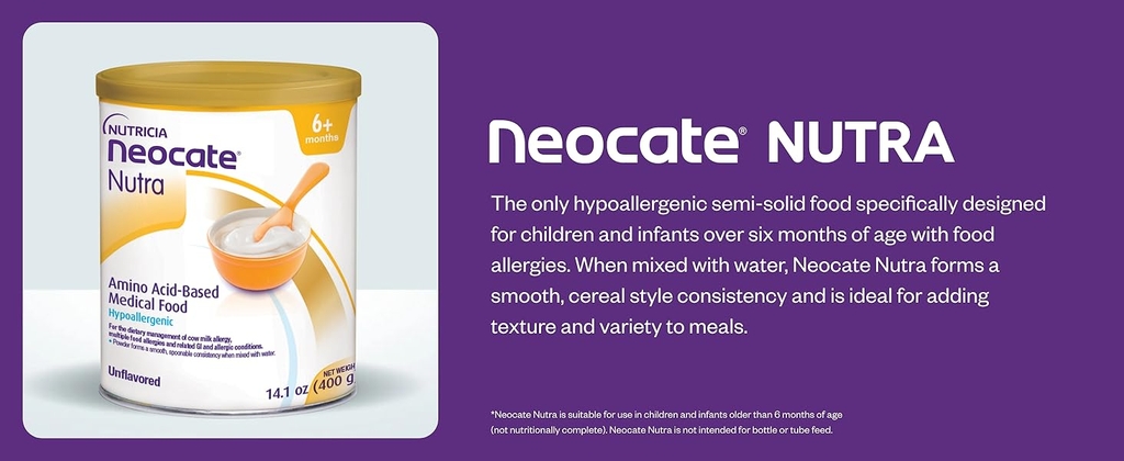Nutricia Neocate Nutra 14.1 oz: Lý tưởng cho trẻ 6+ tháng, dạng rắn dễ ăn, hỗ trợ dị ứng thức ăn, EoE, tăng chiều cao với canxi, vitamin D.