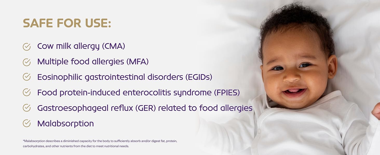100% axit amin tự do, không chứa protein gây dị ứng (sữa bò, đậu nành, gluten, lactose), hiệu quả giải quyết triệu chứng CMA, MFA, EoE sau 1-4 tuần.