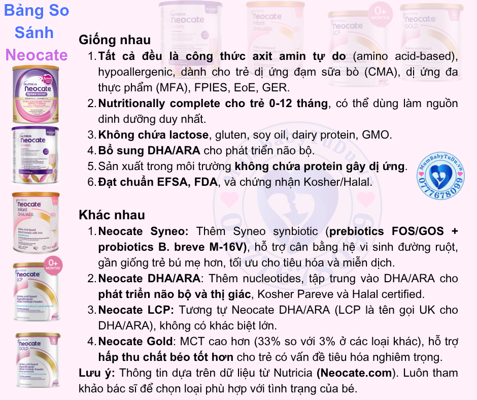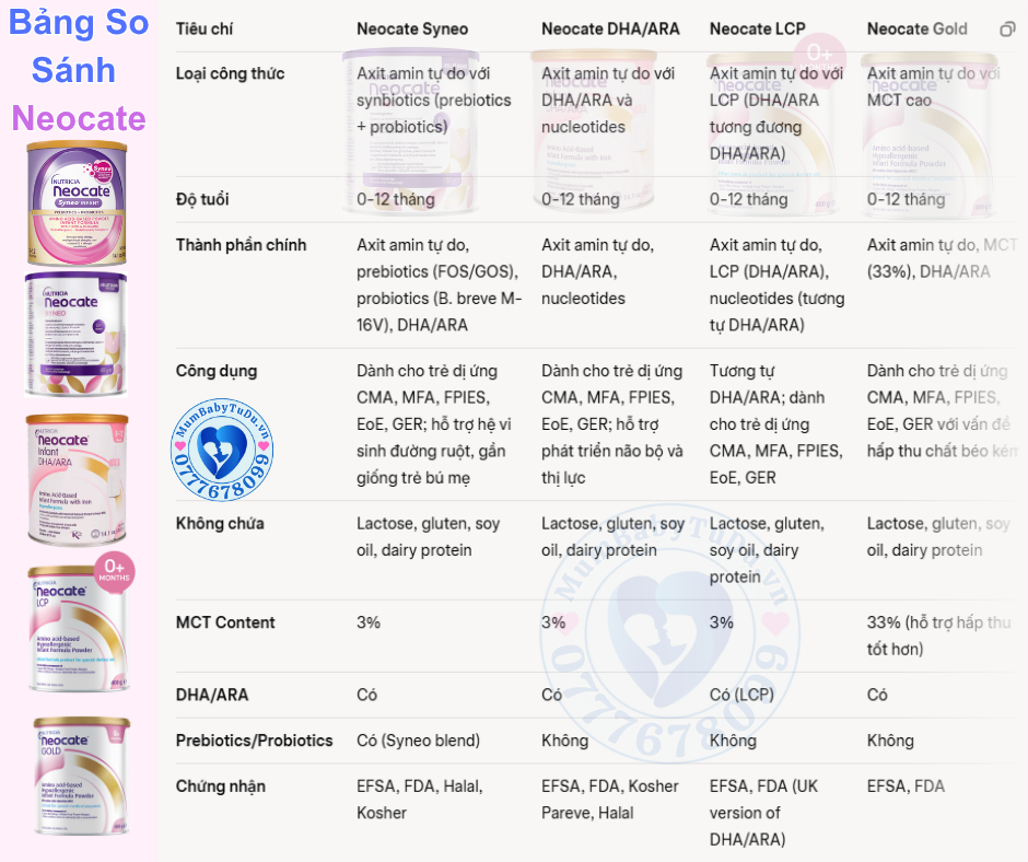 Nếu bạn đang tìm kiếm so sánh Neocate Syneo, DHA/ARA, LCP, Gold, thì bài viết này sẽ giúp bạn hiểu rõ sự khác biệt giữa các loại sữa Neocate. Neocate là dòng sữa công thức dựa trên axit amin tự do (amino acid-based), dành cho trẻ sơ sinh và trẻ nhỏ bị dị ứng đạm sữa bò (CMA), dị ứng đa thức ăn (MFA), FPIES, EoE, GER và các vấn đề tiêu hóa liên quan. Các sản phẩm Neocate được chứng nhận EFSA, FDA, Halal, Kosher, không chứa lactose, gluten, soy oil, dairy protein, GMO, giúp trẻ phát triển khỏe mạnh mà không gây dị ứng.