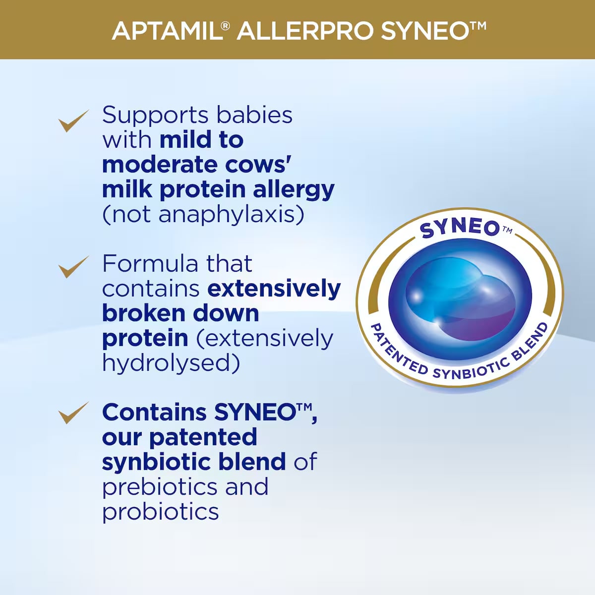 Alt Text: Infographic 4 tính năng sữa Aptamil AllerPro Syneo Số 1: Thủy phân, Syneo, không lactose, dưỡng chất.