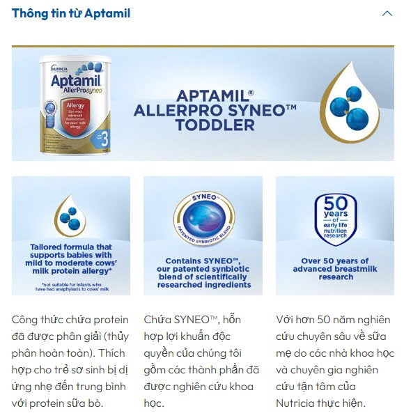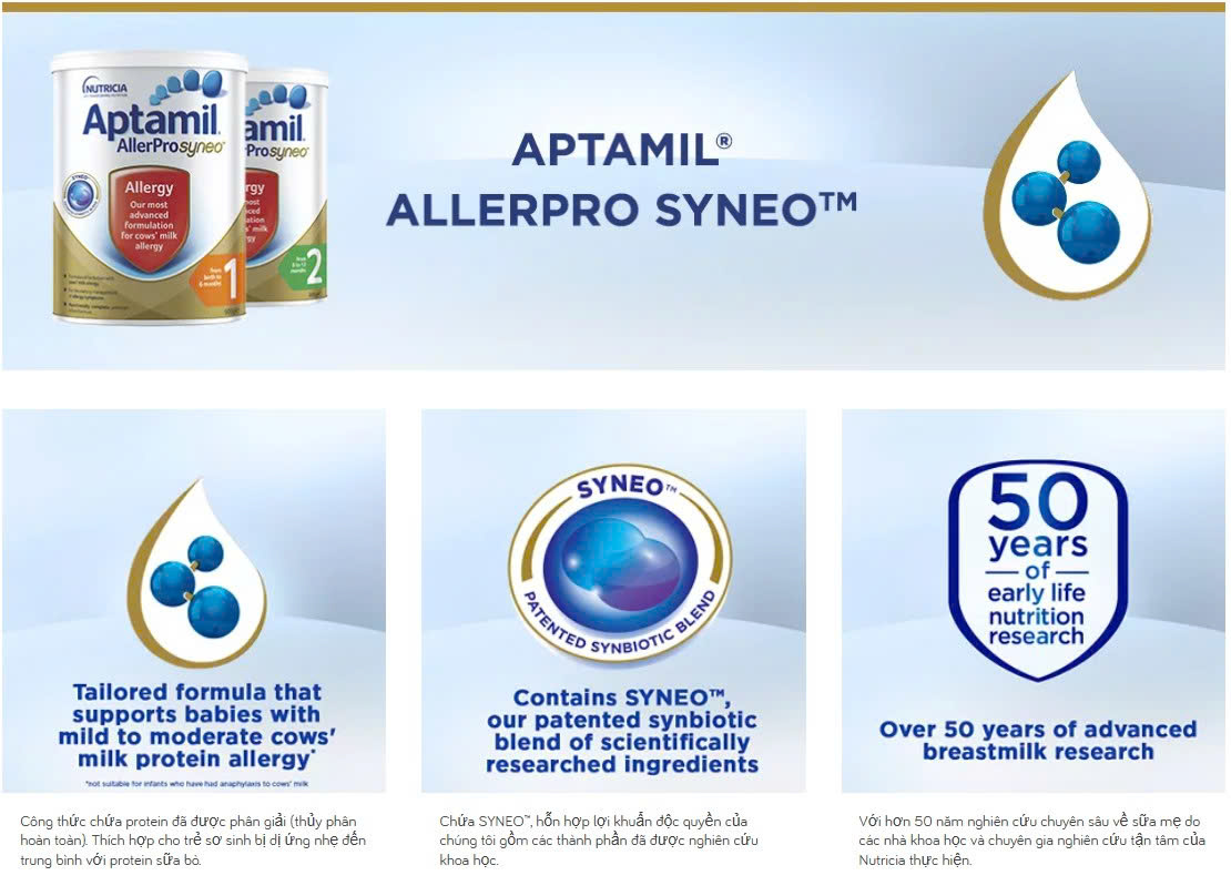 Từ khóa rộng: Sữa Aptamil AllerPro Syneo Số 2 có tốt không, sữa hipoallegenic cho bé dị ứng đạm sữa bò 6-12 tháng giá 2026, cách dùng Aptamil AllerPro Syneo cho bé ăn dặm, Aptamil chính hãng.