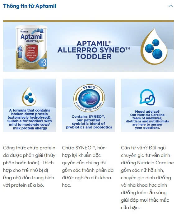 Từ khóa rộng: Lợi ích sữa Aptamil AllerPro Syneo Số 3, sữa hipoallegenic cho bé dị ứng đạm sữa bò 12-36 tháng tăng cân, Aptamil AllerPro Syneo không lactose.