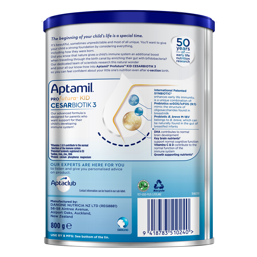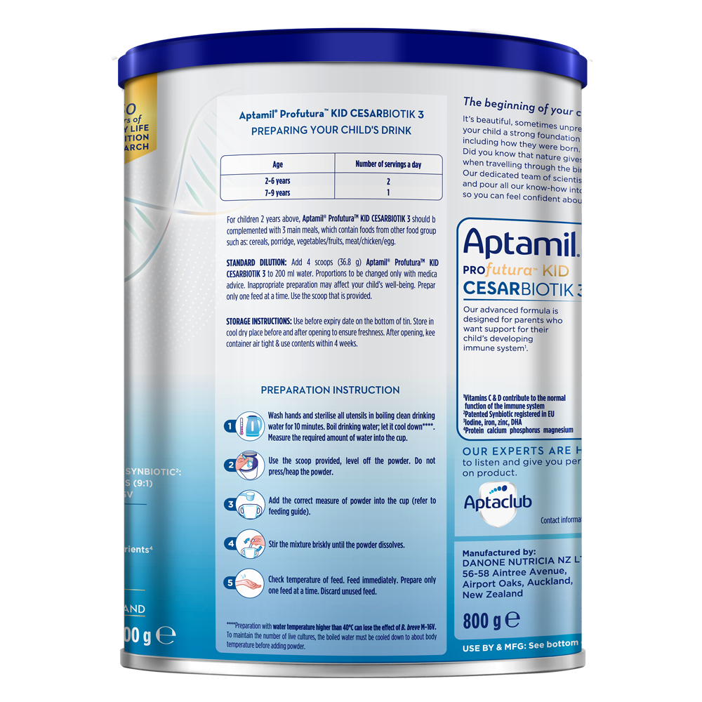 Sữa Aptamil Profutura KID Cesarbiotik 3 800g là sản phẩm dinh dưỡng công thức cao cấp, được thiết kế dành riêng cho trẻ từ 2 tuổi trở lên, đặc biệt phù hợp cho trẻ sinh mổ nhờ công thức CesarbiotikTM độc quyền. Được sản xuất bởi Nutricia (thuộc tập đoàn Danone) tại New Zealand, sản phẩm sử dụng công thức Synbiotic tiên tiến, kết hợp Probiotics (Bifidobacterium breve M-16V) và Prebiotics (scGOS/lcFOS 9:1), hỗ trợ hệ miễn dịch, trí não, và hệ tiêu hóa của bé trong giai đoạn phát triển năng động. Đây là lựa chọn tối ưu để bổ sung dinh dưỡng cho trẻ từ 2 tuổi, kết hợp với chế độ ăn uống hàng ngày.