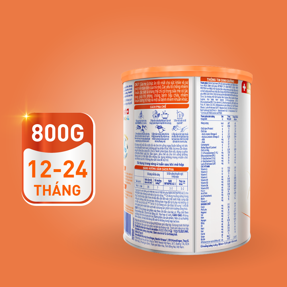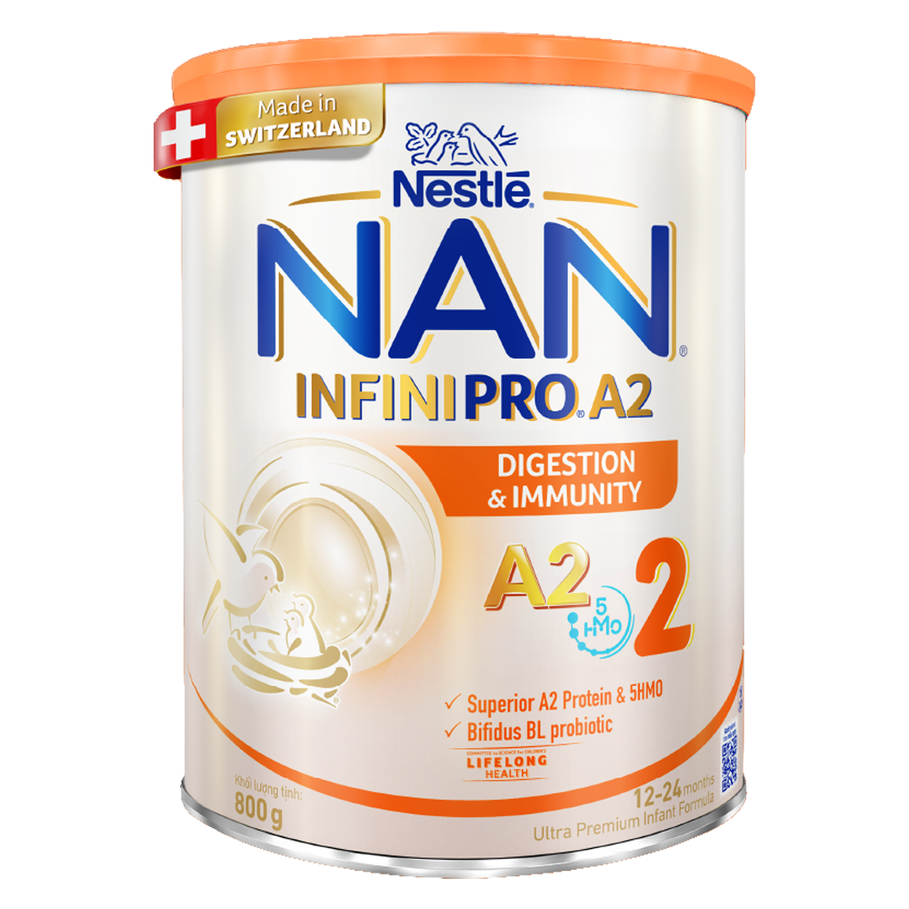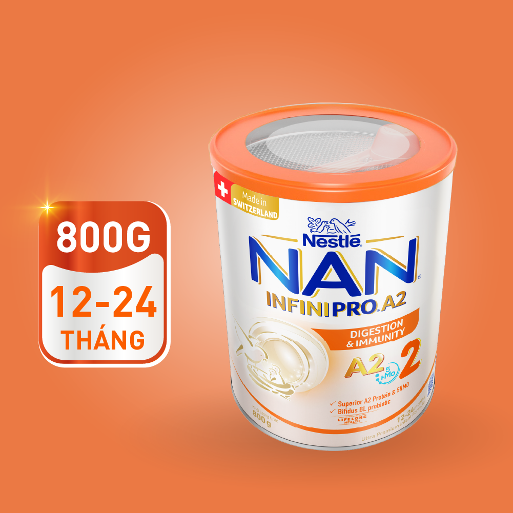 Sữa bột NAN INFINIPRO A2 số 2 800g là giải pháp dinh dưỡng tối ưu cho trẻ từ 1-2 tuổi, với đạm A2, phức hợp 5HMO, DHA, ARA, và lợi khuẩn Bifidus BL, hỗ trợ tiêu hóa, miễn dịch, trí não, và phát triển thể chất. Được sản xuất bởi Nestlé Thụy Sĩ với 150 năm kinh nghiệm, đây là lựa chọn tin cậy của hàng triệu bà mẹ. Mua ngay tại Con Cưng, Babivina, hoặc Shopee Mall để đảm bảo hàng chính hãng và nhận ưu đãi tốt nhất!
