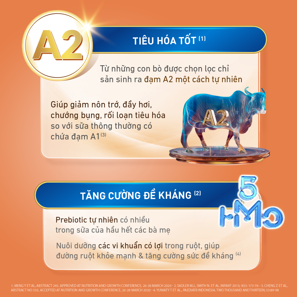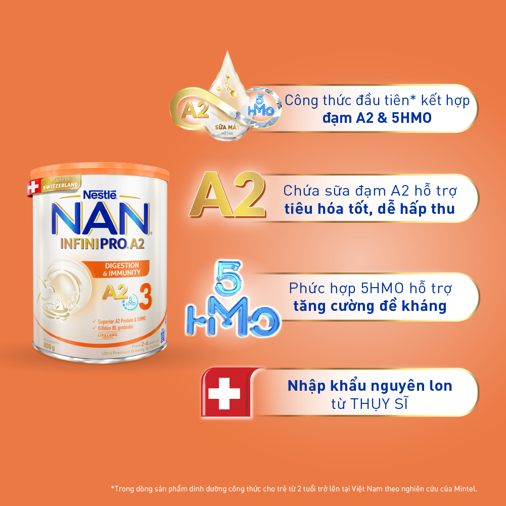 Đạm A2 từ giống bò thuần chủng (cung cấp bởi Cayuga, Mỹ) có cấu trúc tương tự đạm sữa mẹ, dễ tiêu hóa, giảm nguy cơ đầy hơi, nôn trớ, hoặc táo bón. Phức hợp 5HMO (2'-FL, DFL, LNT, 3'-SL, 6'-SL) và lợi khuẩn Bifidus BL nuôi dưỡng hệ vi sinh đường ruột, cải thiện hấp thu dinh dưỡng. Theo nghiên cứu của Nestlé (2023), 90% trẻ sử dụng NAN INFINIPRO A2 có hệ tiêu hóa ổn định sau 4 tuần.