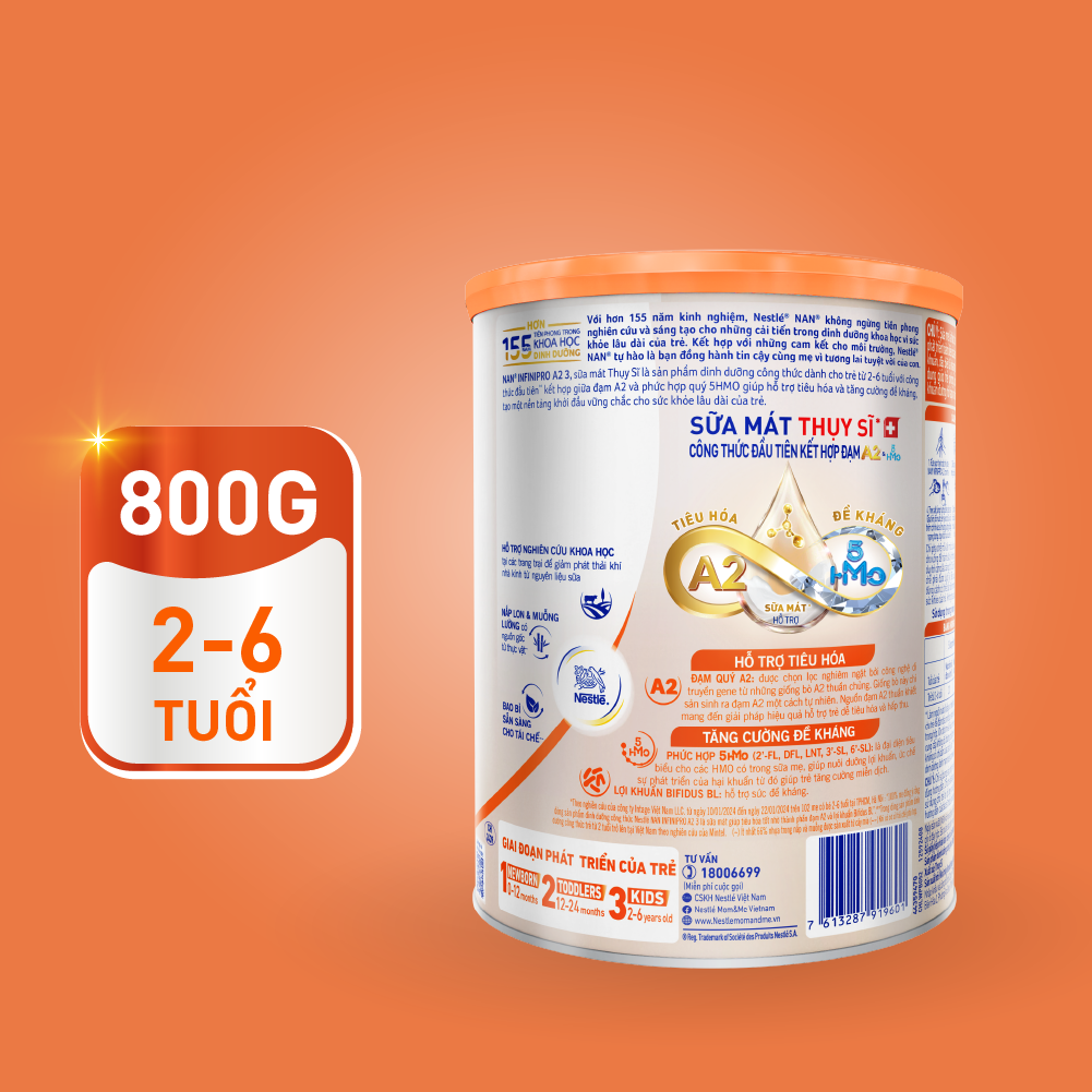 Sữa bột NAN INFINIPRO A2 số 3 800g là giải pháp dinh dưỡng tối ưu cho trẻ từ 2-6 tuổi, với đạm A2, phức hợp 5HMO, DHA, ARA, và lợi khuẩn Bifidus BL, hỗ trợ tiêu hóa, miễn dịch, trí não, và phát triển thể chất. Được sản xuất bởi Nestlé Thụy Sĩ với 150 năm kinh nghiệm, đây là lựa chọn tin cậy của hàng triệu bà mẹ. Mua ngay tại Con Cưng, Babivina, hoặc Shopee Mall để đảm bảo hàng chính hãng và nhận ưu đãi tốt nhất!