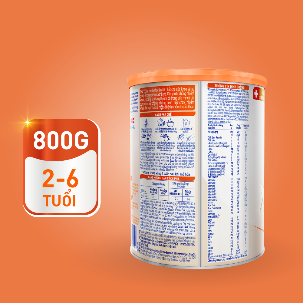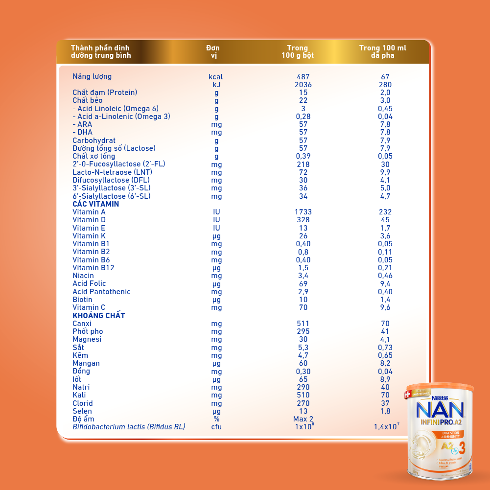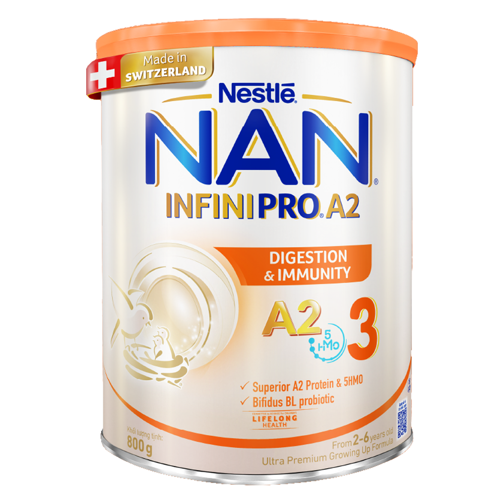 Sữa bột NAN INFINIPRO A2 số 3 800g là sản phẩm dinh dưỡng cao cấp của Nestlé (Thụy Sĩ), được thiết kế dành riêng cho trẻ từ 2-6 tuổi trong giai đoạn phát triển mạnh về thể chất và trí tuệ. Với công thức đột phá kết hợp đạm A2, phức hợp 5HMO, DHA, ARA, lợi khuẩn Bifidus BL, và các vi chất thiết yếu, sản phẩm hỗ trợ tiêu hóa khỏe mạnh, tăng cường miễn dịch, phát triển trí não, thị lực, và xương khớp. Được chứng nhận an toàn bởi FDA (Cục Quản lý Thực phẩm và Dược phẩm Hoa Kỳ) và EFSA (Cơ quan An toàn Thực phẩm Châu Âu), sữa NAN INFINIPRO A2 số 3 là lựa chọn hàng đầu của các bà mẹ Việt Nam để xây dựng nền tảng vững chắc cho bé yêu.