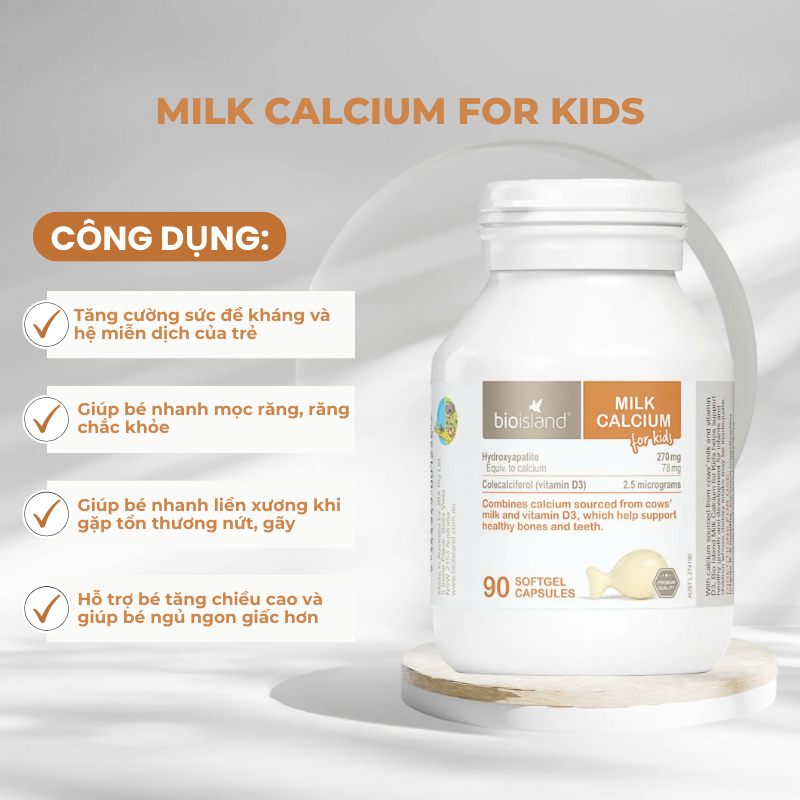 Sữa canxi cho trẻ em Bio Island Milk Calcium For Kids là sản phẩm bổ sung canxi cao cấp từ Bio Island (Úc, hơn 50 năm kinh nghiệm, sản xuất từ nông trại hữu cơ Úc), dành cho trẻ từ 0 tháng tuổi trở lên cần hỗ trợ xương răng khỏe mạnh. Với công thức độc quyền canxi hydroxyapatite từ sữa bò (dễ hấp thu 95%, không gây táo bón), vitamin D3 tăng hấp thu canxi 30%, sản phẩm giúp trẻ phát triển xương chắc khỏe, răng chắc, giảm nguy cơ còi xương, hỗ trợ chiều cao theo chuẩn WHO. Sữa canxi Bio Island không chứa GMO, hormone, chất bảo quản, viên nang hình cá dễ uống (0 vị), được chứng nhận hữu cơ ACO, nghiên cứu lâm sàng chứng minh hiệu quả, tin dùng bởi hàng triệu mẹ Việt, Úc. Đây là lựa chọn lý tưởng cho trẻ sơ sinh và trẻ nhỏ, đặc biệt với hộp 90 viên tiện lợi 2025.