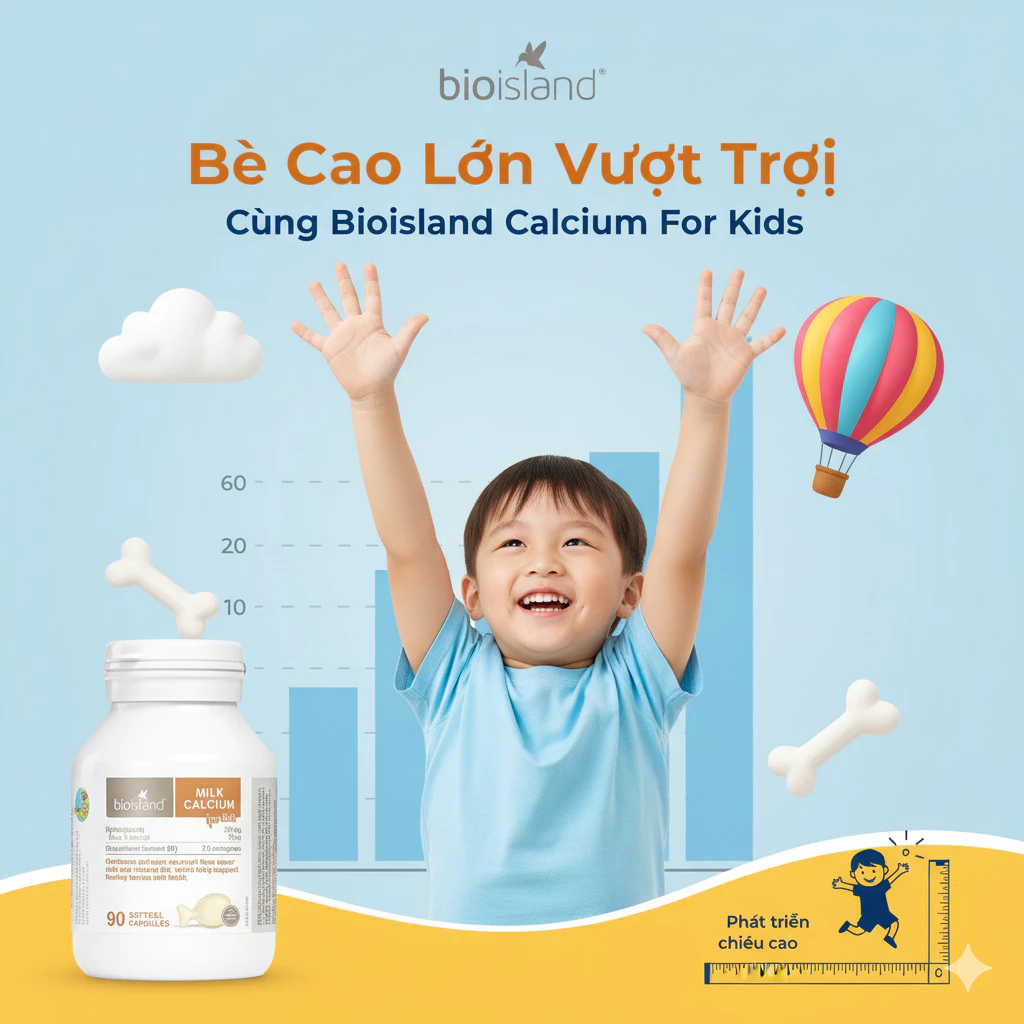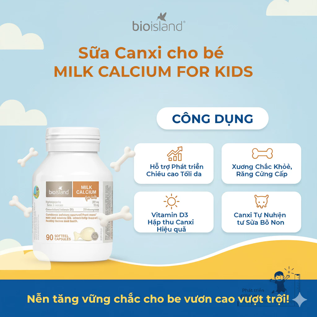 Nghiên cứu hỗ trợ: Nghiên cứu Bio Island (2023) chứng minh trẻ dùng Milk Calcium tăng mật độ xương 25%, hấp thu canxi tốt hơn 95% sau 12 tuần.
