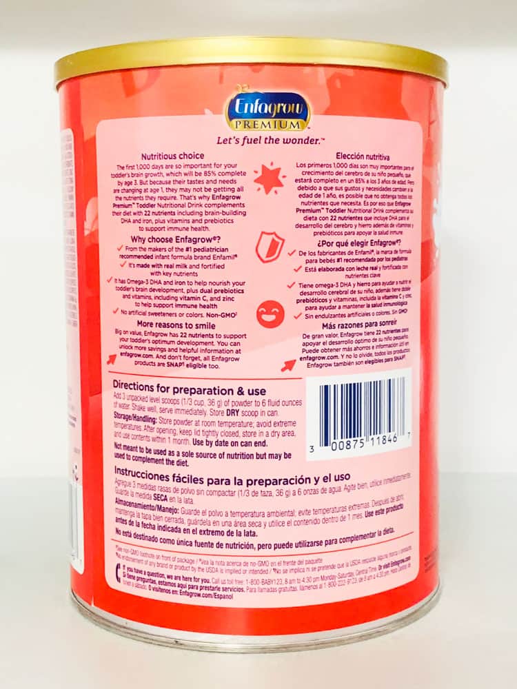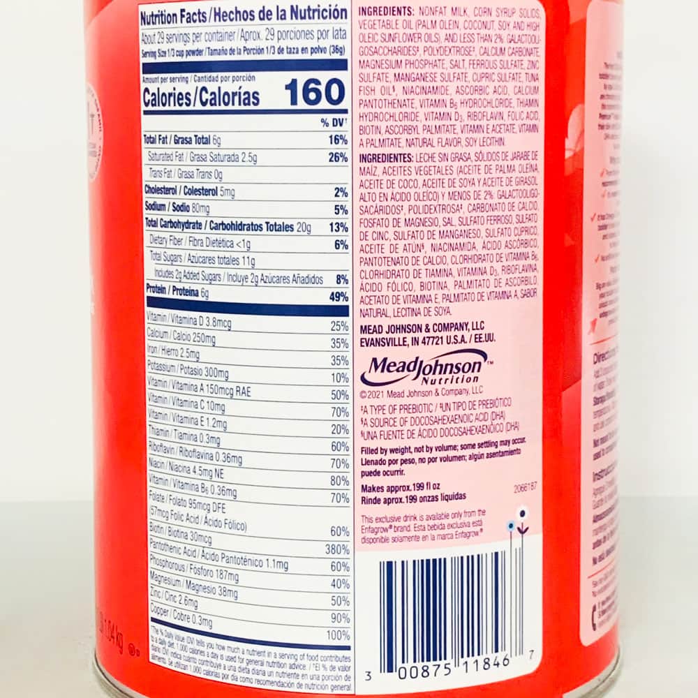 Chứa 26mg DHA (Omega-3) trong mỗi khẩu phần, gấp đôi lượng DHA so với Similac Go & Grow (12.7mg DHA), hỗ trợ phát triển trí não, cải thiện khả năng nhận thức, ghi nhớ, và thị lực. 85% sự phát triển não bộ diễn ra trong 3 năm đầu đời, và Enfagrow giúp bổ sung DHA để bù đắp sự thiếu hụt khi trẻ chuyển sang sữa bò.