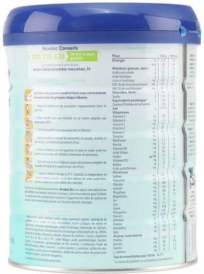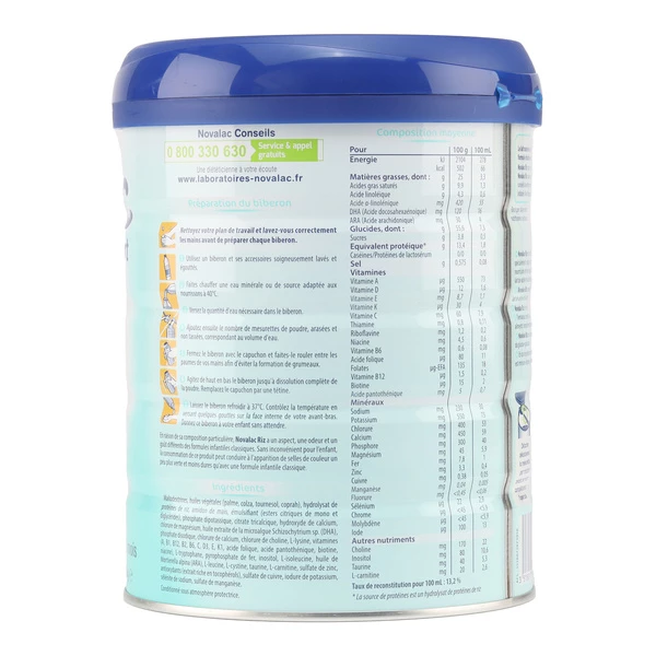 Sữa gạo Novalac Riz 800g có công thức độc quyền với protein gạo thủy phân, không lactose, cung cấp năng lượng cao và an toàn cho bé dị ứng. Dưới đây là bảng thành phần dinh dưỡng chính (trong 100g bột), dựa trên thông số cập nhật từ Novalac năm 2025: