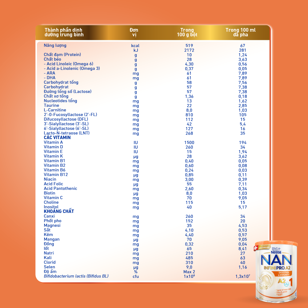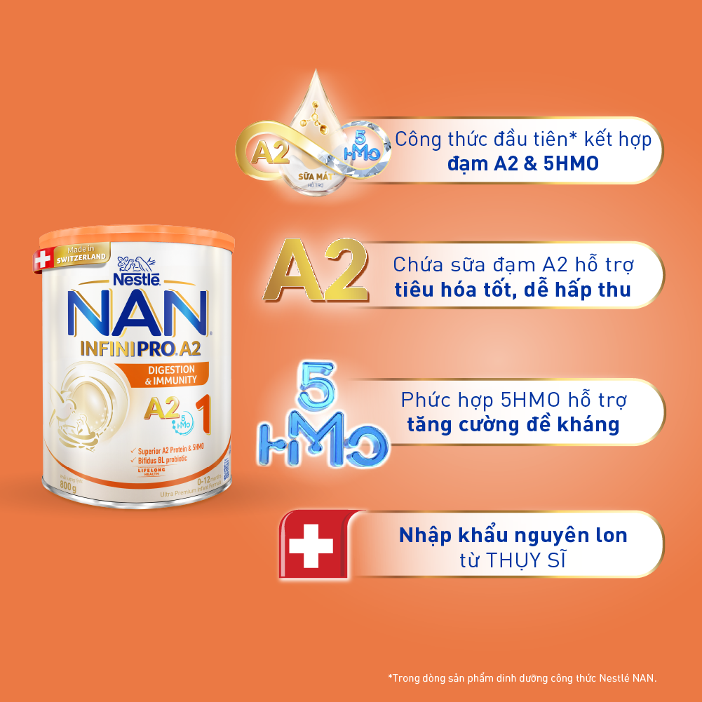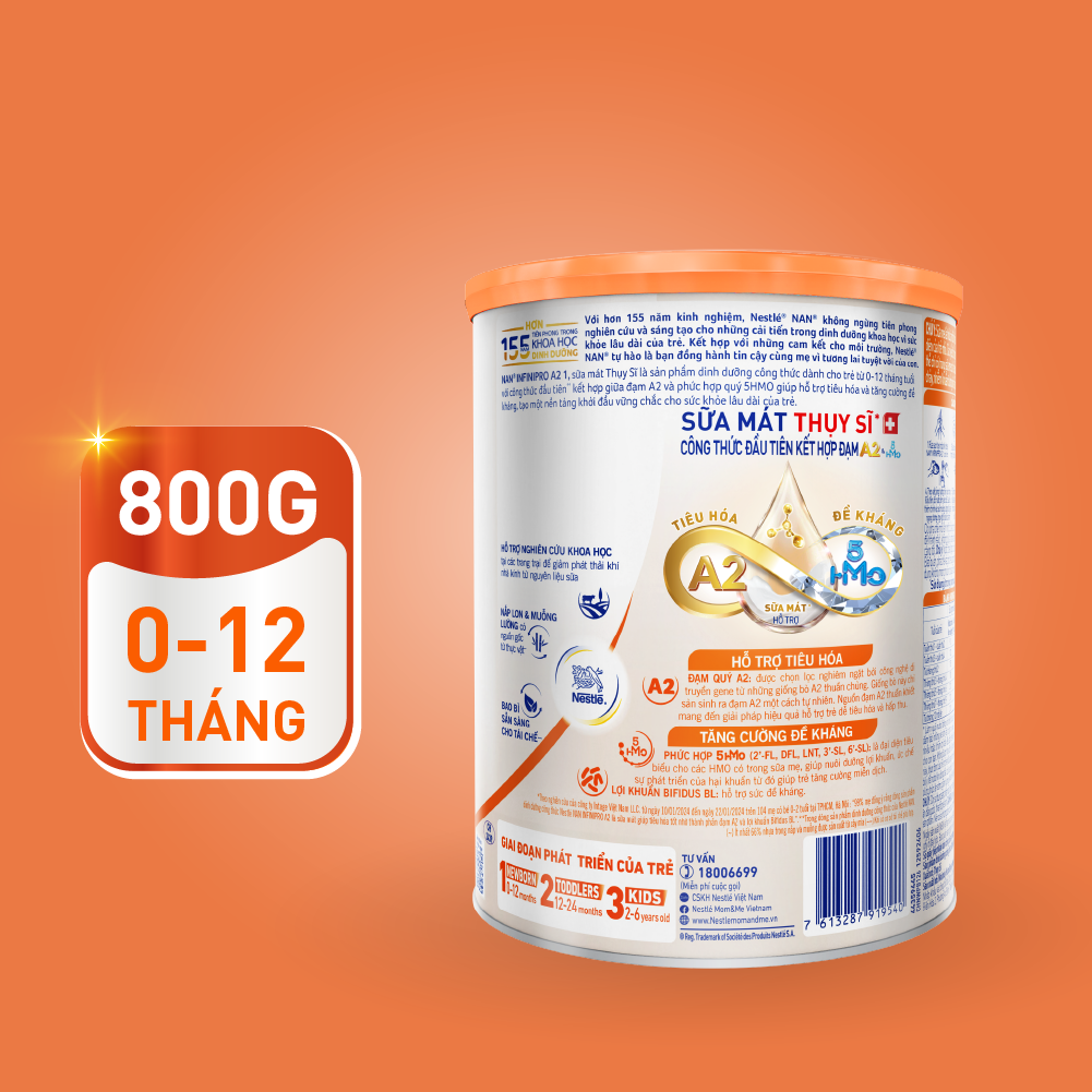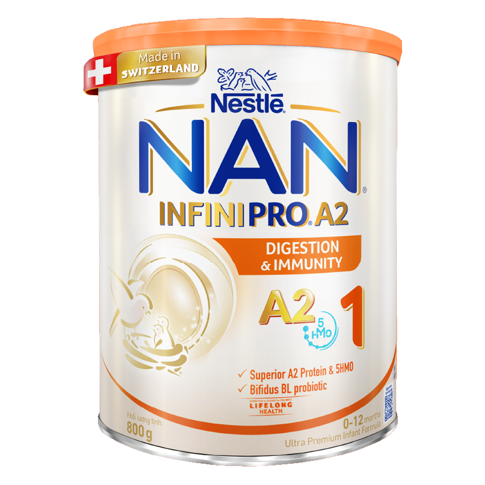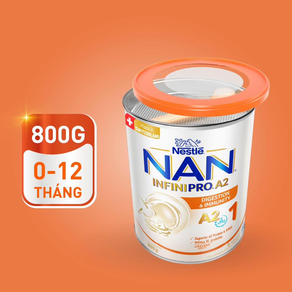Sữa NAN INFINIPRO A2 800g Số 1 là dòng sữa công thức cao cấp dành cho trẻ từ 0-12 tháng tuổi, được sản xuất bởi Nestlé tại Nhà máy Konolfingen, Thụy Sĩ và nhập khẩu chính hãng bởi Công ty TNHH Nestlé Việt Nam (trụ sở tại TP.HCM). Với công thức đột phá kết hợp đạm A2, phức hợp 5HMO, đạm OPTIPRO, và lợi khuẩn Bifidus BL, sản phẩm mang lại nguồn dinh dưỡng gần giống sữa mẹ, hỗ trợ trí não, hệ miễn dịch, hệ tiêu hóa, và tăng trưởng thể chất của trẻ trong năm đầu đời. Được chứng nhận an toàn bởi EFSA (Cơ quan An toàn Thực phẩm Châu Âu) và FDA (Cục Quản lý Thực phẩm và Dược phẩm Hoa Kỳ), sữa đặc biệt phù hợp cho trẻ sinh non, cơ địa nhạy cảm, dễ đầy hơi, nôn trớ, hoặc dị ứng đạm sữa bò thông thường.