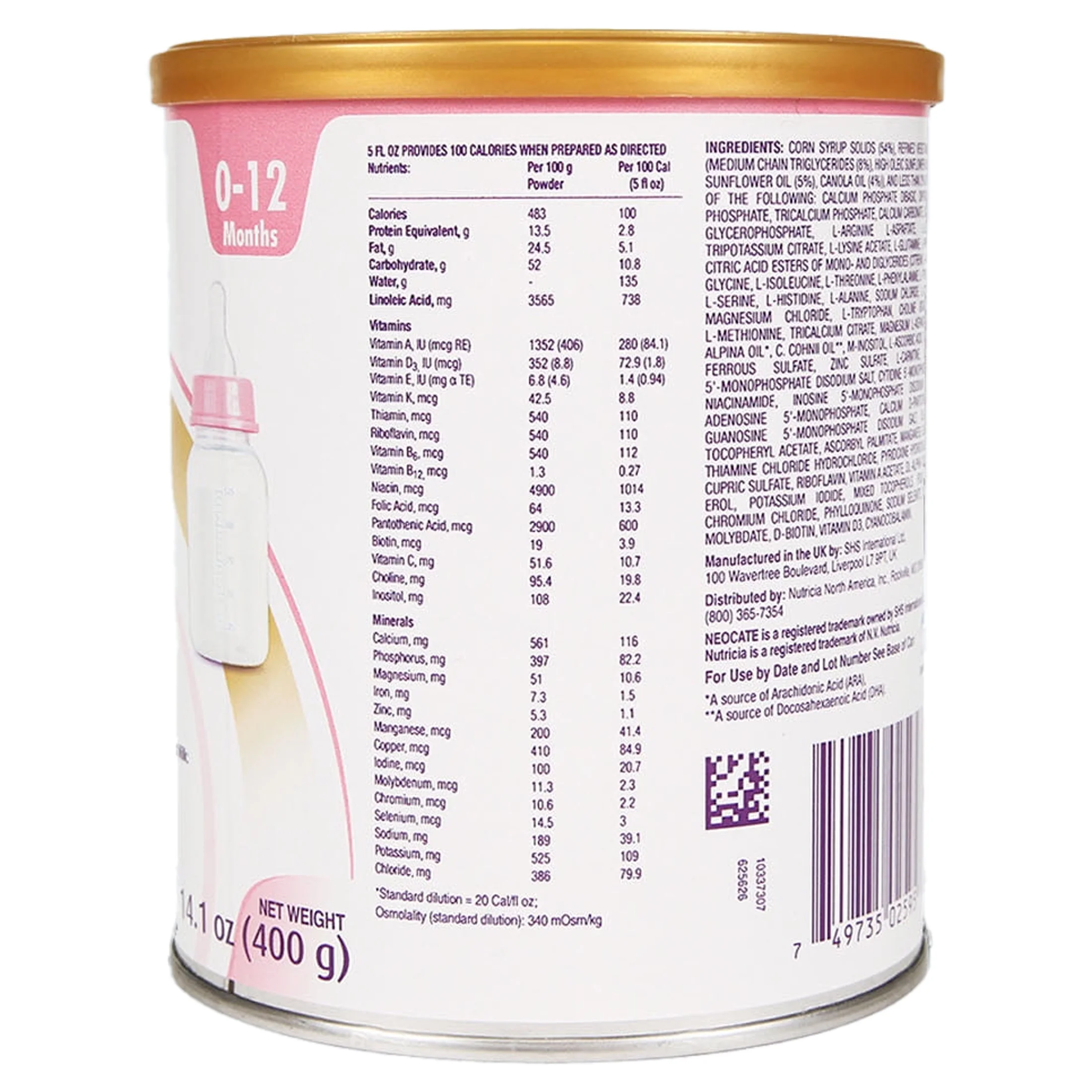 Sữa Neocate Infant DHA/ARA 400g có công thức acid amin tự do, cung cấp dưỡng chất cao mà không gây dị ứng. Dựa trên thông số cập nhật từ Nutricia năm 2025, bảng thành phần dinh dưỡng chính (trong 100g bột) như sau: