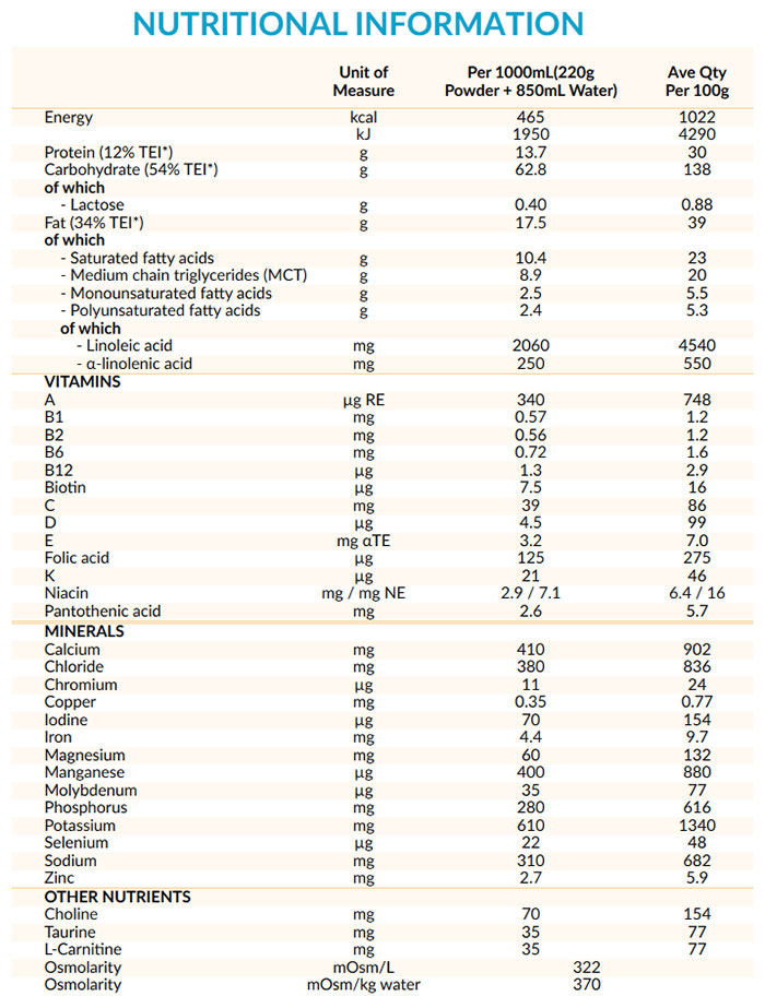 Pha 1-1.5 kcal/ml tùy nhu cầu, dùng nước 40°C.
