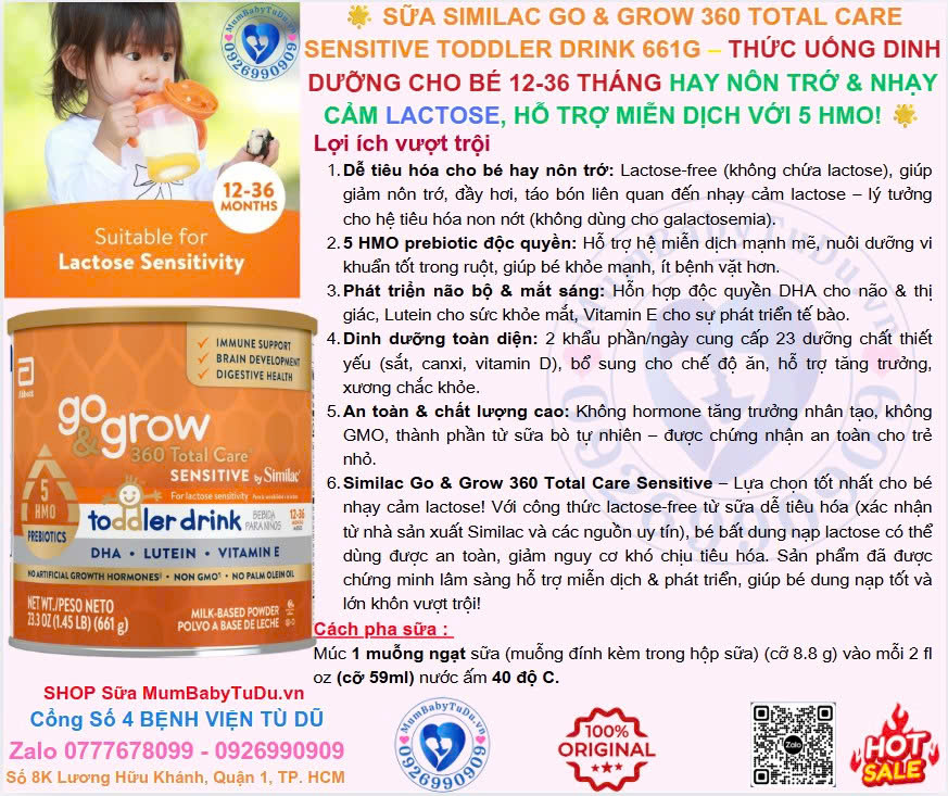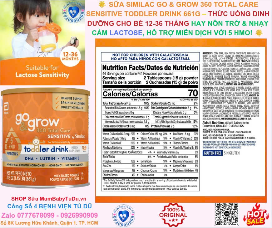 Mẹ ơi, bé yêu nhà mình từ 12-36 tháng tuổi hay nôn trớ, đầy hơi hoặc hệ tiêu hóa nhạy cảm với lactose? Khám phá ngay Sữa Similac Go & Grow 360 Total Care Sensitive Toddler Drink 661g – sản phẩm cao cấp từ Mỹ (Abbott Nutrition), thức uống dinh dưỡng duy nhất tại Mỹ chứa 5 HMO prebiotic cho trẻ nhỏ nhạy cảm lactose! Đây là thức uống dễ tiêu hóa từ sữa, hỗ trợ sức khỏe tiêu hóa, nuôi dưỡng vi khuẩn có lợi trong đường ruột (nơi 70% hệ miễn dịch tồn tại), giúp bé phát triển toàn diện mà không lo khó chịu hay nôn trớ thường gặp.