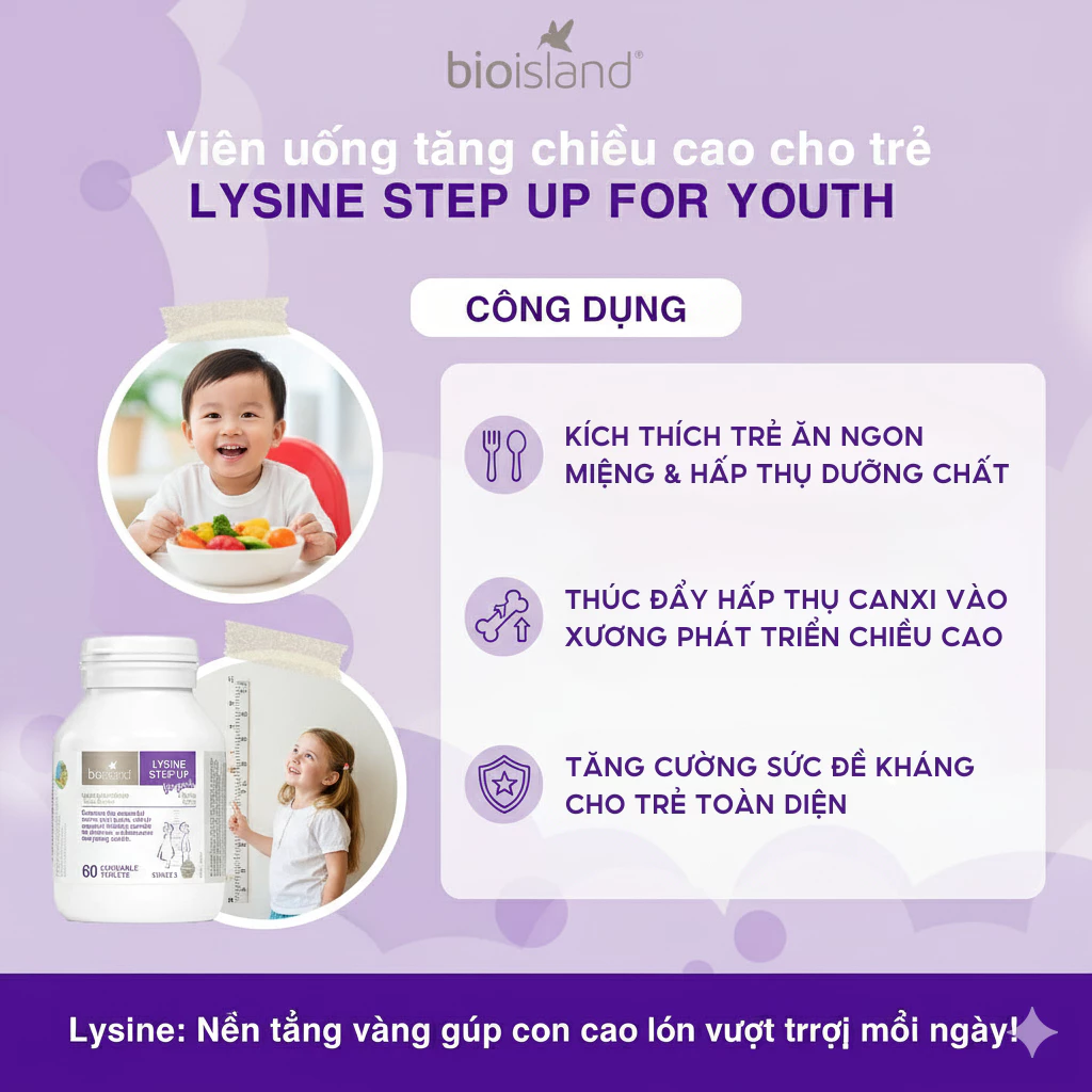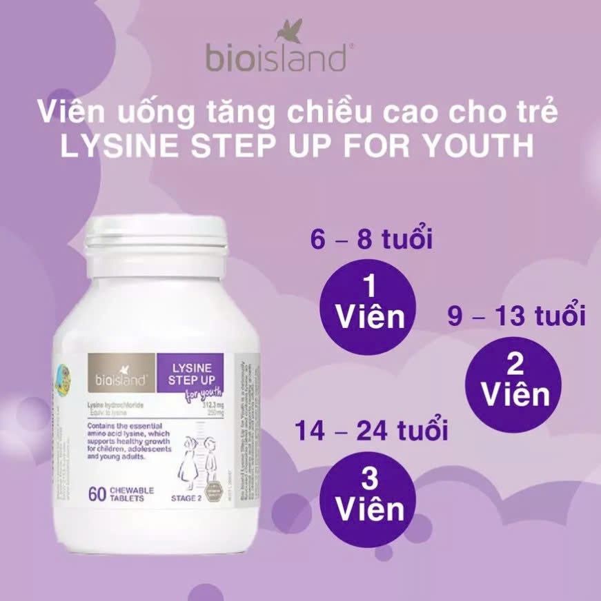 Meta Description: Bioisland Lysine Step Up For Youth 60 viên Úc – Viên nhai tăng chiều cao cho trẻ 6 tuổi trở lên, bổ sung Lysine 300mg, canxi, vitamin D3, kẽm. Giá 2025, mua chính hãng tại MumBabyTuDu.vn, giao nhanh TP HCM, Hà Nội, Đà Nẵng!