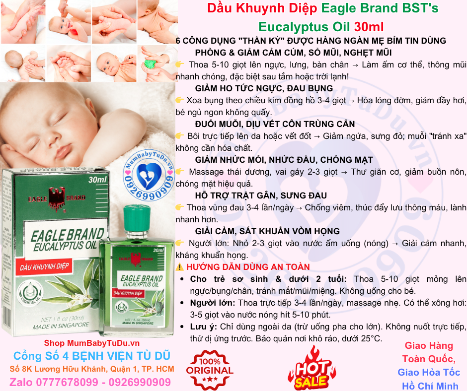 Tinh Dầu Khuynh Diệp Con Ó 2 Nắp Eagle Brand Eucalyptus Oil 30ml là lựa chọn hoàn hảo giúp giữ ấm, giảm cảm lạnh, thư giãn và bảo vệ bé yêu trong mùa lạnh. Sản phẩm chính hãng có sẵn tại Mum Baby Từ Dũ – đảm bảo chất lượng, nguồn gốc rõ ràng, và giao hàng tận nơi siêu nhanh.