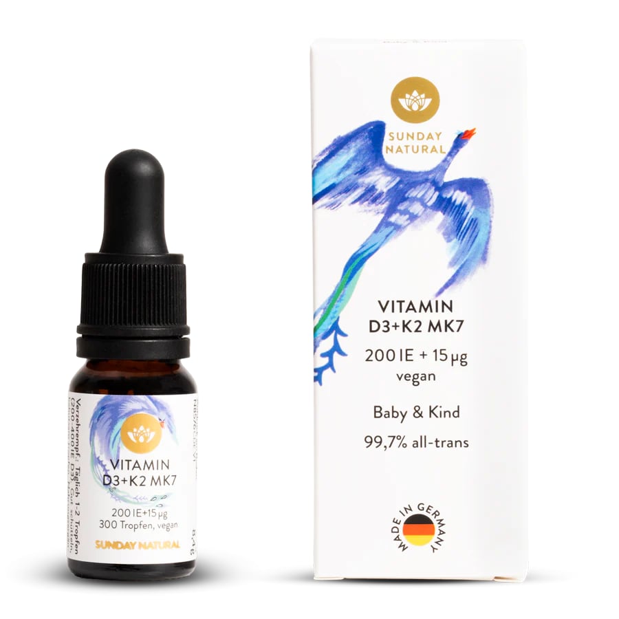 Vitamin D3 K2 MK7 Sunday Natural Đức 200IE là giọt bổ sung vitamin D3 K2 cho bé tăng chiều cao cao cấp từ Sunday Natural (Đức, sản xuất theo tiêu chuẩn EU), dành cho bé từ sơ sinh (0+) cần bổ sung vitamin D3 K2 dễ hấp thu, xương chắc khỏe. Với công thức D3 200IE + K2 MK7 15µg/giọt, dầu dừa MCT organic, sản phẩm giúp hấp thu canxi 95%, tăng chiều cao 2-4cm/năm, miễn dịch mạnh, giảm ốm vặt. Vitamin D3 K2 Sunday Natural không GMO, hormone, vị trung tính dễ uống, chứng nhận EU organic, nghiên cứu lâm sàng chứng minh, tin dùng bởi hàng triệu mẹ Việt, Đức. Đây là giải pháp vàng cho bé thiếu nắng, hộp 20ml tiện lợi 2025!